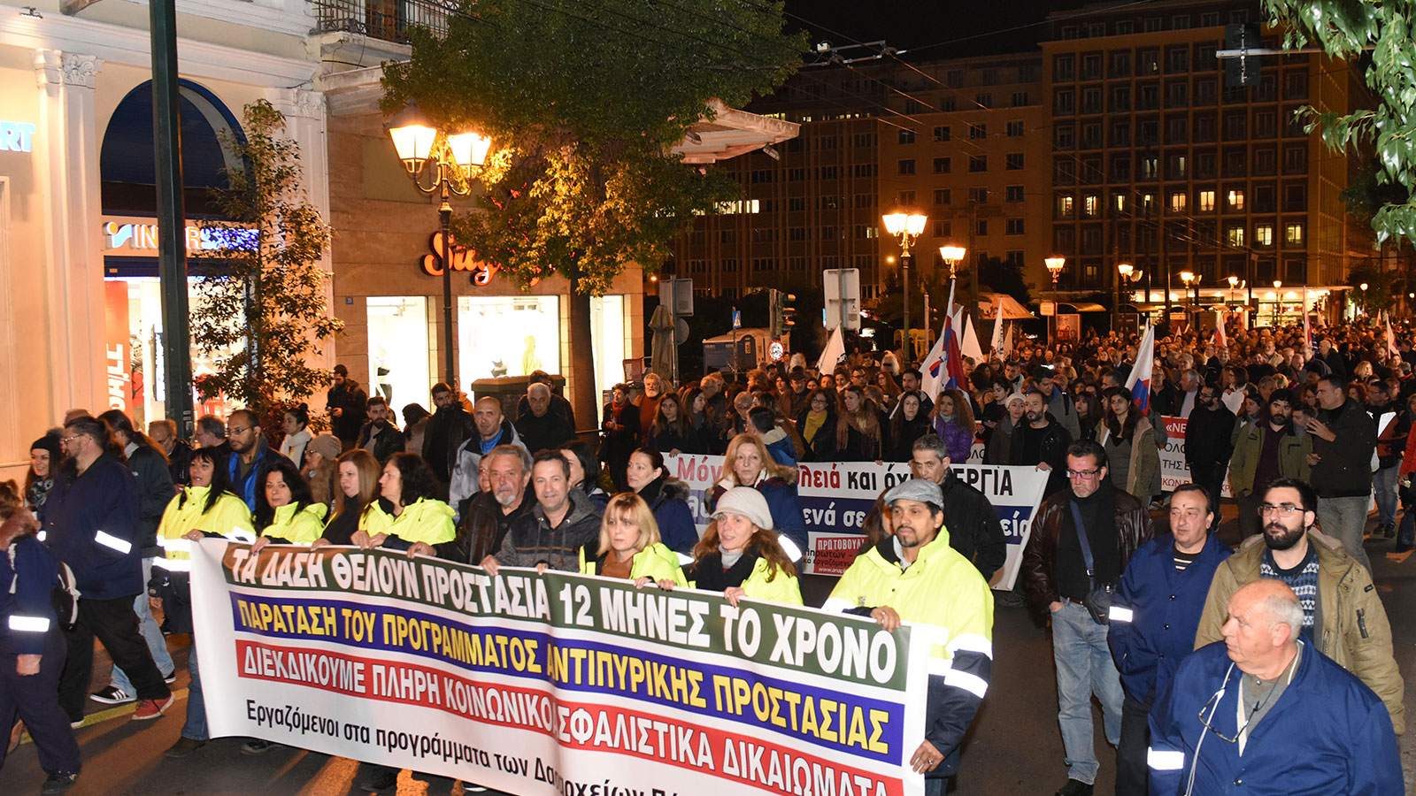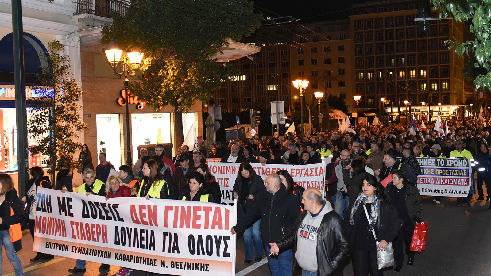«Μόνιμη δουλειά ζητά η εργατιά, όχι άλλα προνόμια για τ’ αφεντικά» διαδήλωσαν πίσω από τα πανό σωματείων και επιτροπών αγώνα συμβασιούχοι στους Δήμους, αναπληρωτές εκπαιδευτικοί, εργαζόμενοι με ελαστικές μορφές στην Υγεία, δασεργάτες μέσα από το πρόγραμμα της «κοινωφελούς εργασίας».
